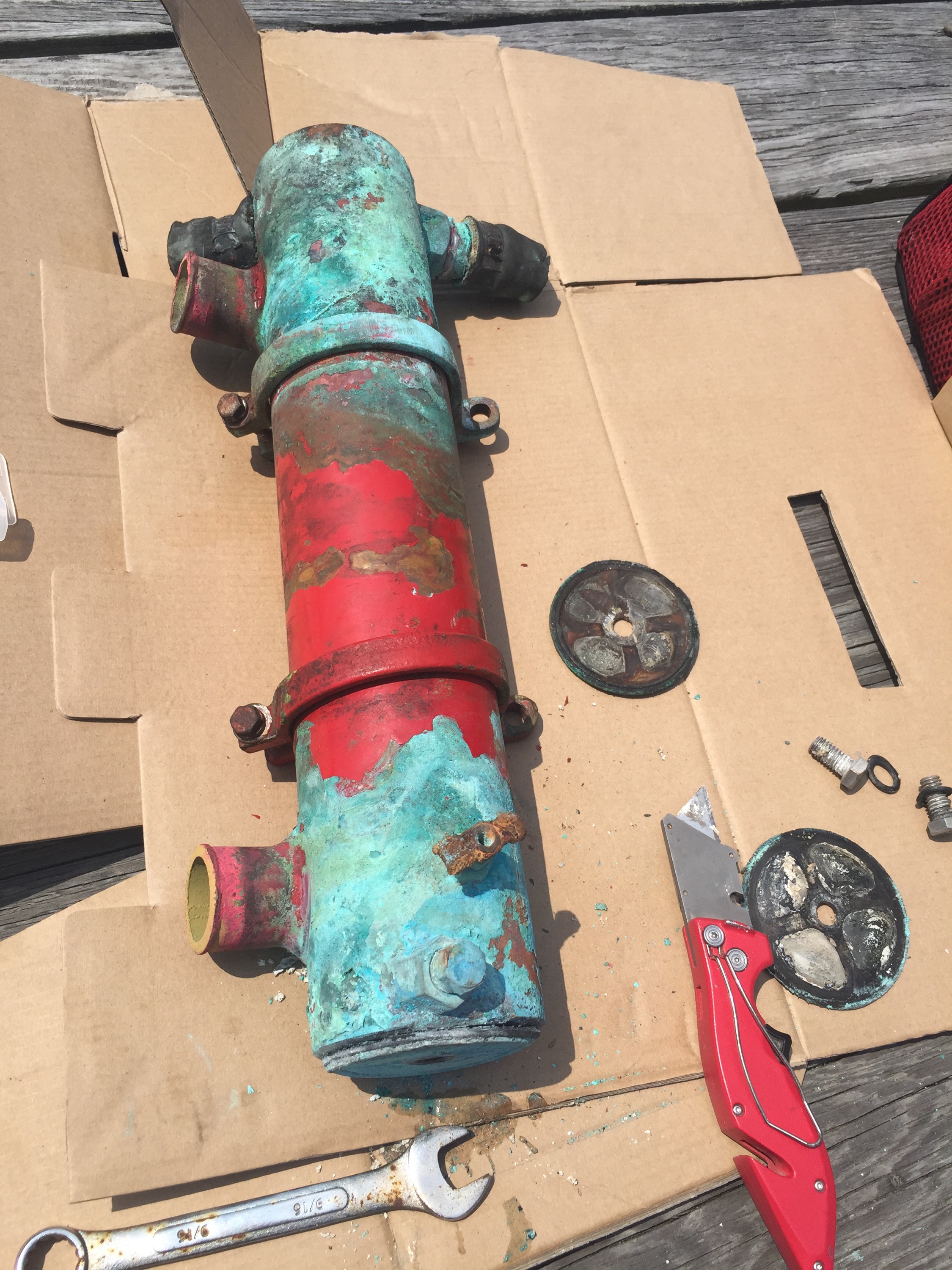 Vellamo has a 46hp Westerbeke engine that is raw water cooled. There’s a heat exchanger that basically acts like a radiator. The original one was in rough shape, so I pulled it out to clean it up. Looks like it hasn’t been done in a while.