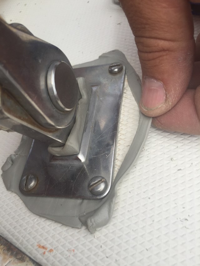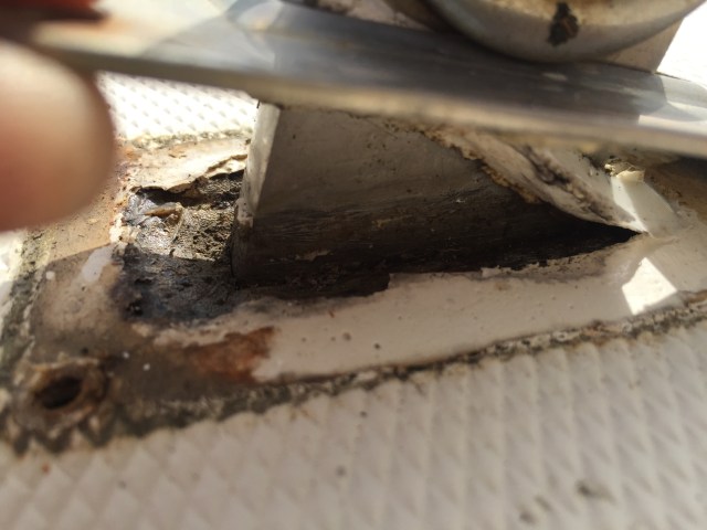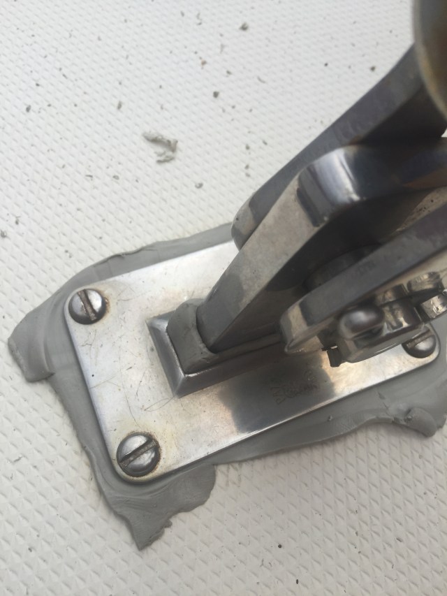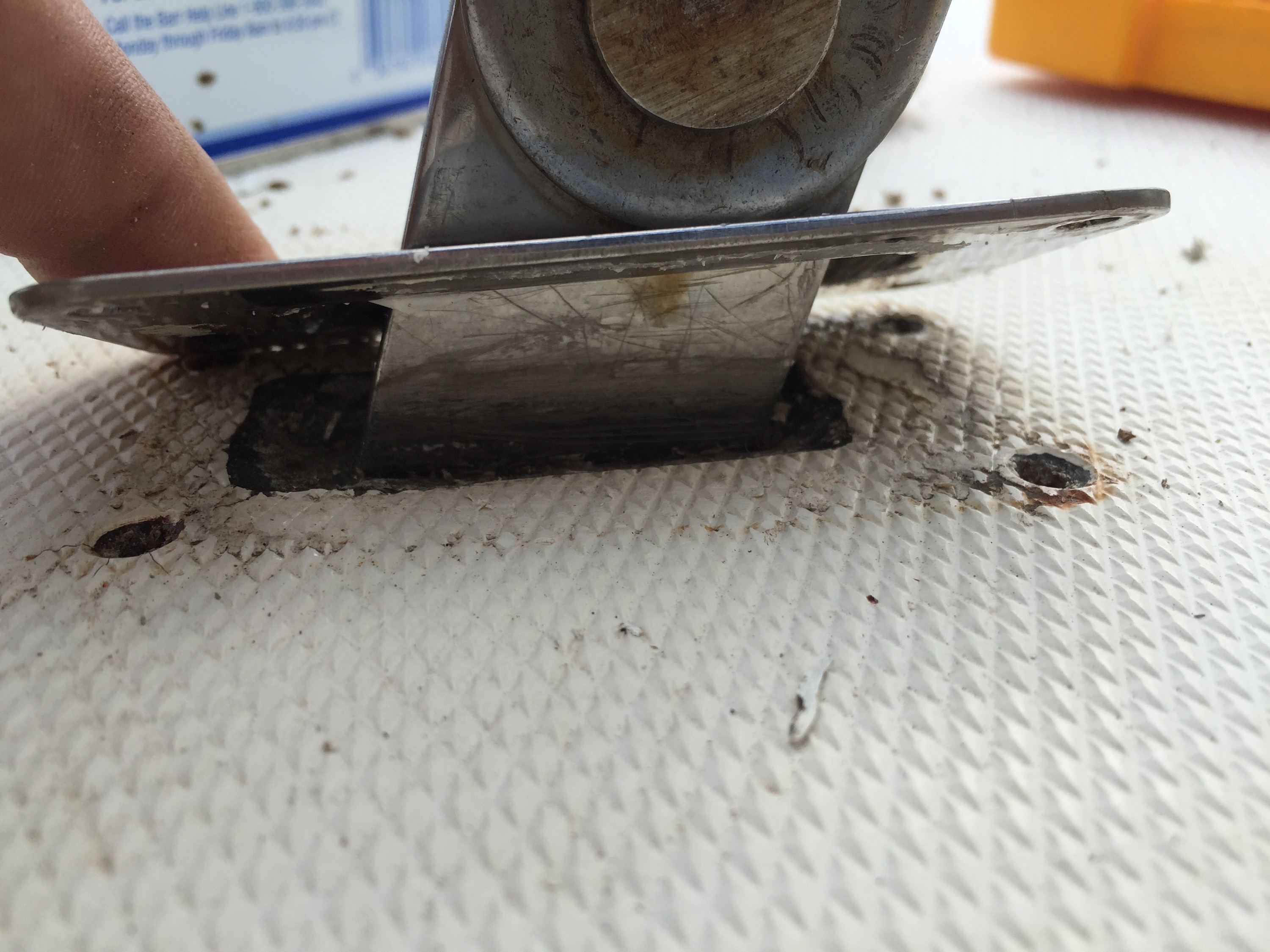 One area of special concern are the shrouds. I pulled all of the plates on each of the 6 areas they penetrate the deck, and rebed them all with butyl. Sabre did a really cool thing where they chamfered out the fiberglass at each penetration, and then used plates with a little reversed chamfer to allow for a good bead of sealant there. This lets the rigging move and flex a little while still keeping a bond and stay sealed.